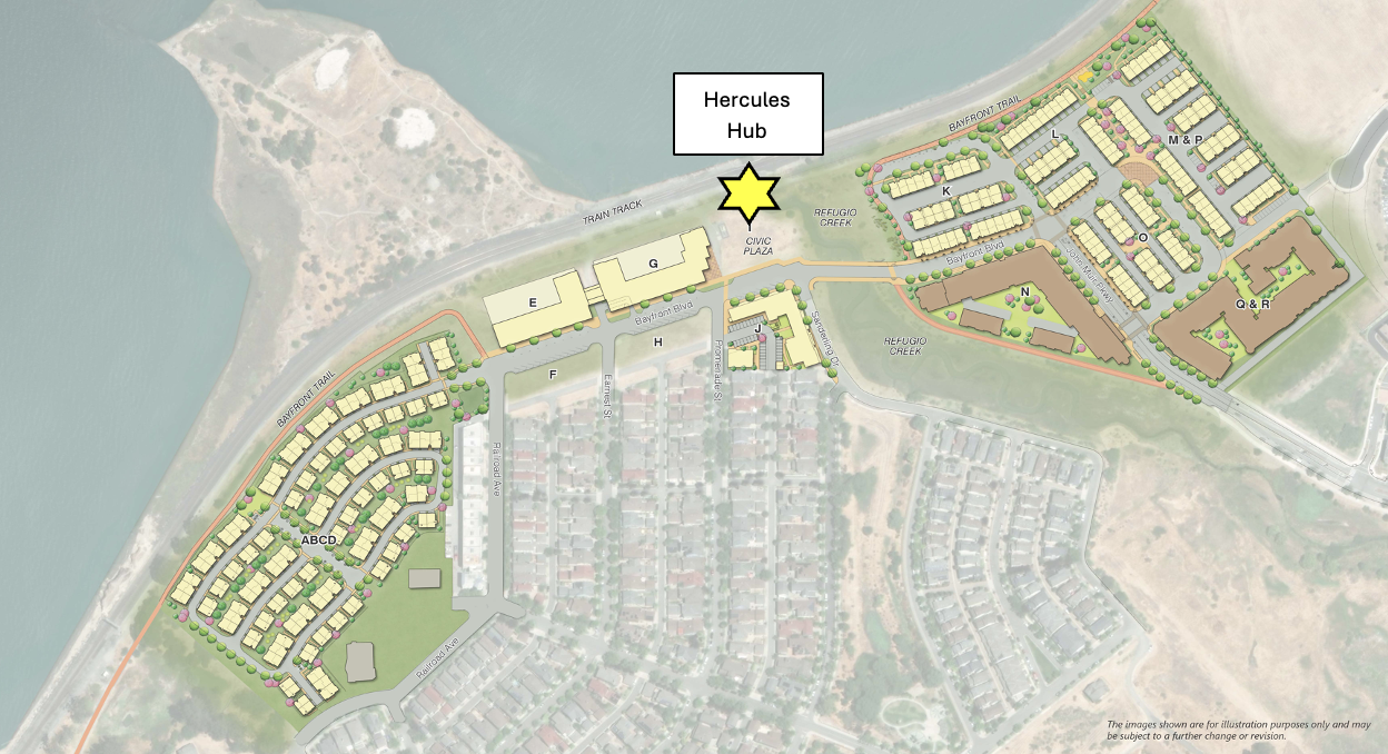 The Hub is a regional, state-of-the-art housing and transportation development in Hercules. It will connect thousands of housing units with a new train stop along the Capitol Corridor, bicycle and pedestrian pathways, bus routes, carpool options, and a future ferry service.